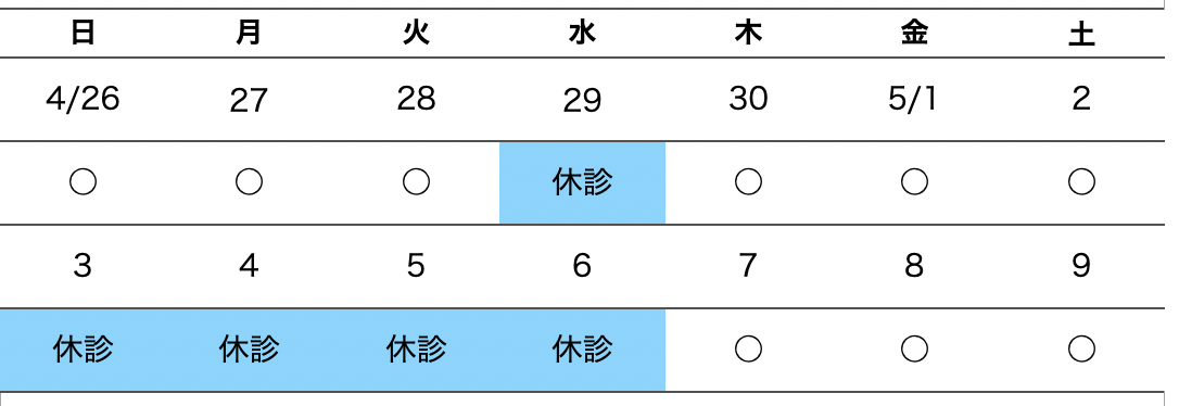GW期間中は上記のような診察となります。ご理解の程、よろしくお願いいたします。 |