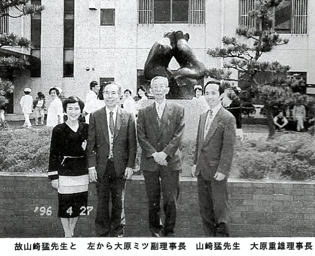 山崎猛先生のご功績に関しては、「蝋型ブロンズ」自著、一九八六年、 茨城新聞社版に執筆されているので割愛させていただく。ただブロンズ制作の手順と労力が複雑高度であること、そして先生は美術教育(茨大教育学部教授兼任)を通じて指導なされた多くの弟子をかかえて、築炉焼成、鋳込みなど重労働を率先されたことが健康を害する原因となったものと思う。従って作品数も多く、先生の生地、高萩市に数十を超える巨大な彫像が展示されている。当病院に近い大みか小学校(十数年前に開校した)にも、愛らしい生徒の立像が校内に輝いているのである。